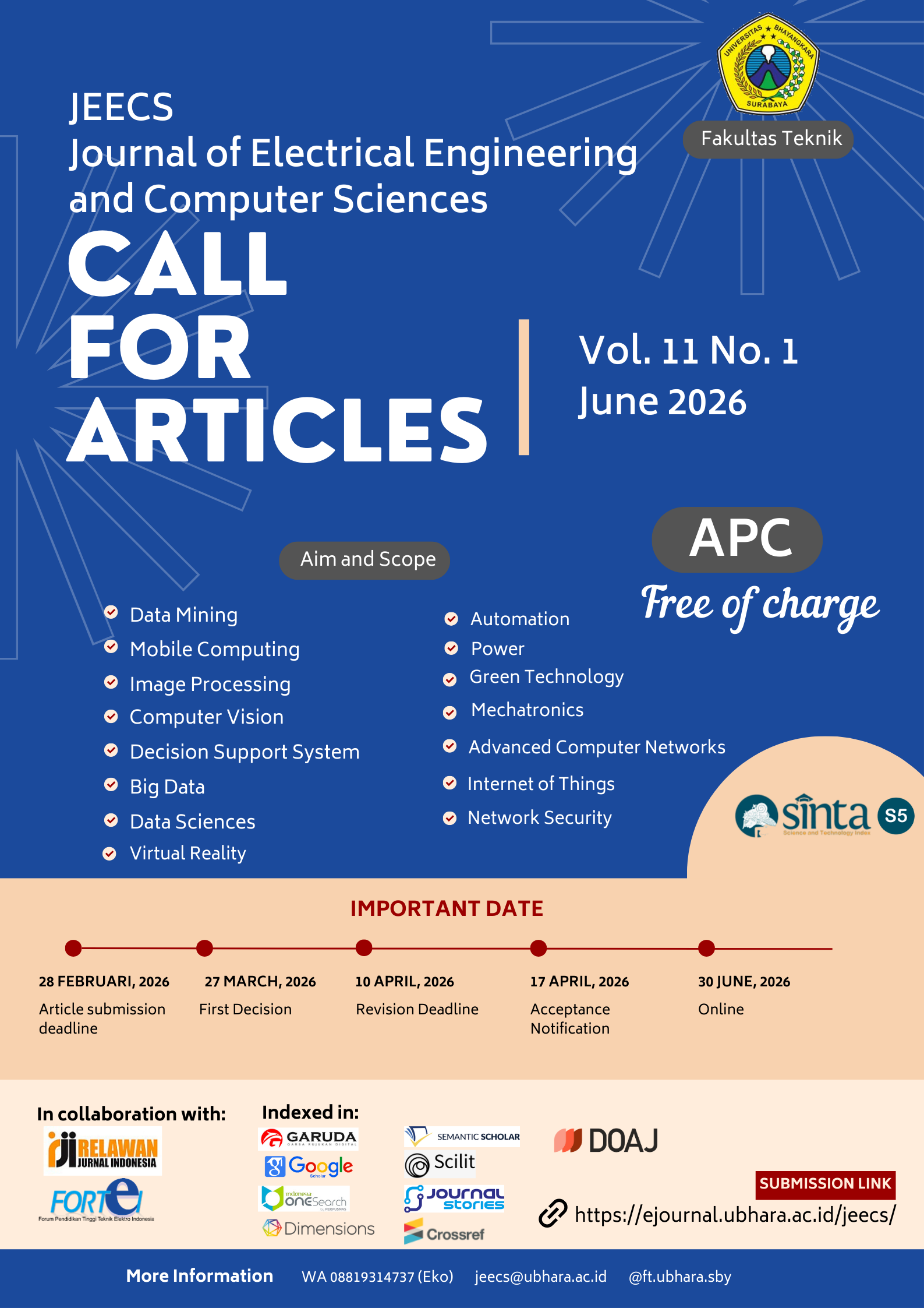 This Journal is published periodically twice a year on June and December. For Further Information, Please Call to Admin Journal at (WA) +62 881-9314-737 or Send Your Email to jeecs@ubhara.ac.id
