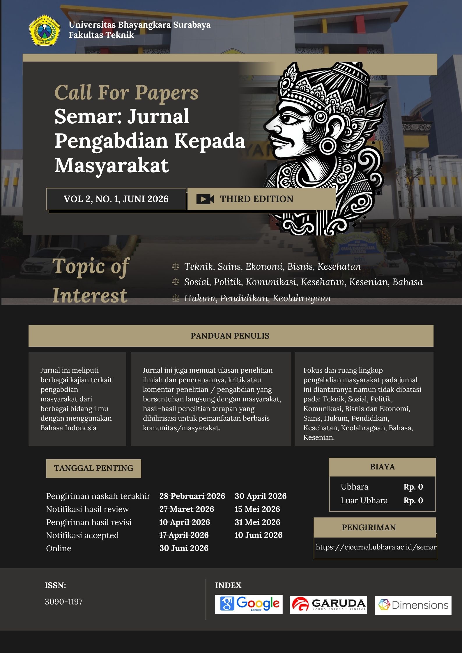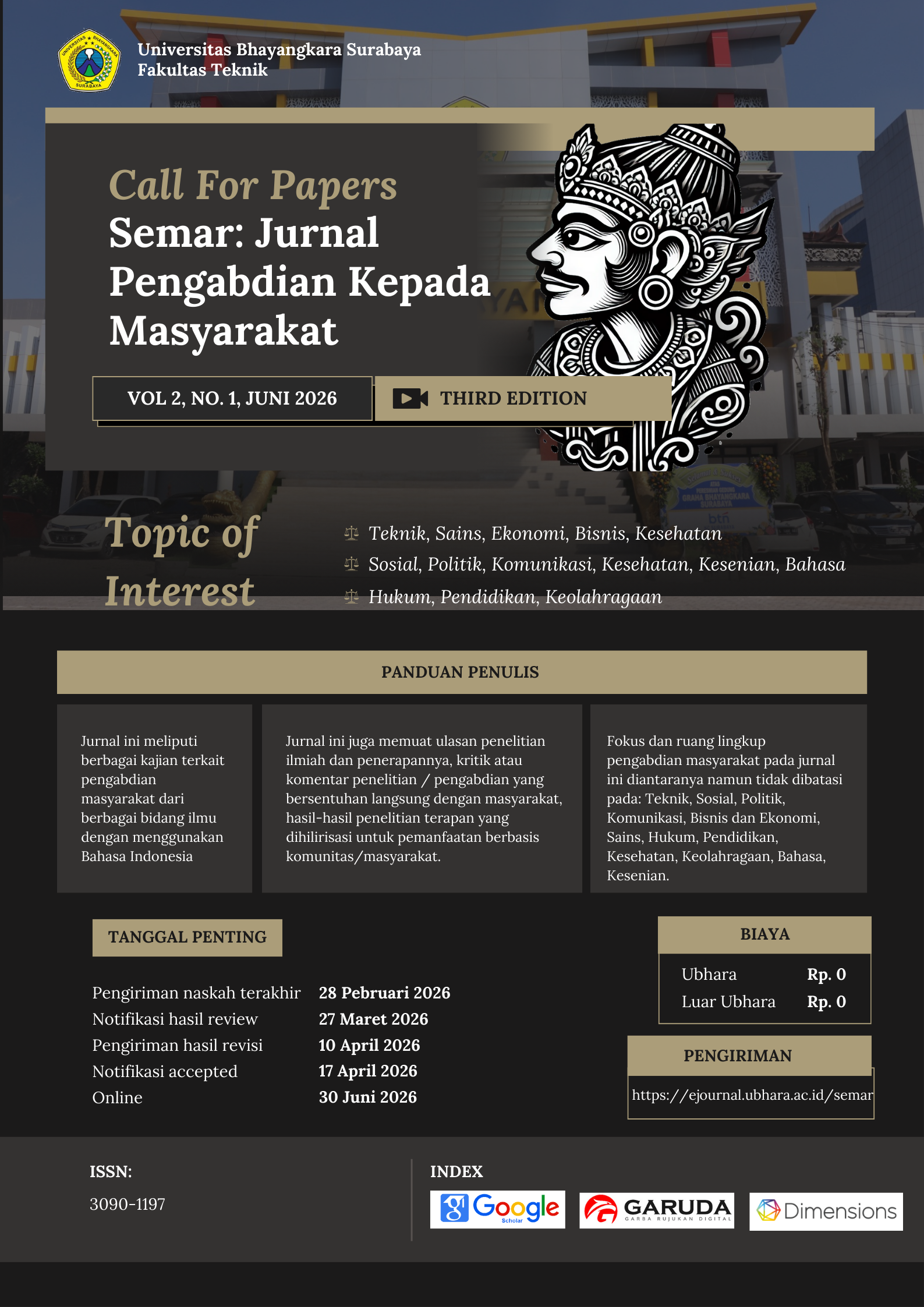 Semar comes from Javanese and is a symbol of devotion and wisdom portrayed by one of the punakawans in the puppet show. The symbol of devotion and wisdom Semar teaches is how to provide care and advice with humility and sincere devotion and provides the right direction of life following morality. This selfless devotion and wisdom inspired the establishment of Semar: Journal of Community Service. This journal also contains reviews of scientific research and its applications, criticism or comments on research / service in direct contact with the community, and the results of applied research that are downstream for community / community-based utilization. This journal was founded by the Faculty of Engineering, Bhayangkara University, Surabaya. Nevertheless, the fields of science in the Community Service scheme include but are not limited to Engineering, Social, Politics, Communication, Business and Economics, Science, Law, Education, Health, Sports, Language, and Arts.